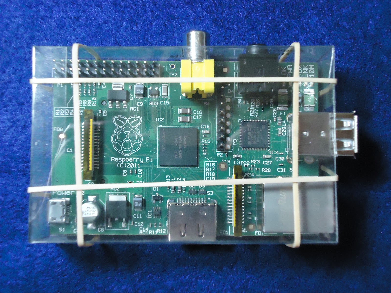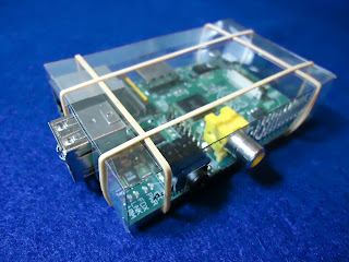 Today I got around to making a case for my Raspberry Pi. I liked the idea of still being able to see the circuit board and components, so I wanted a transparent case. The most conveniently available, viable, transparent material I had lying around was transparency film.